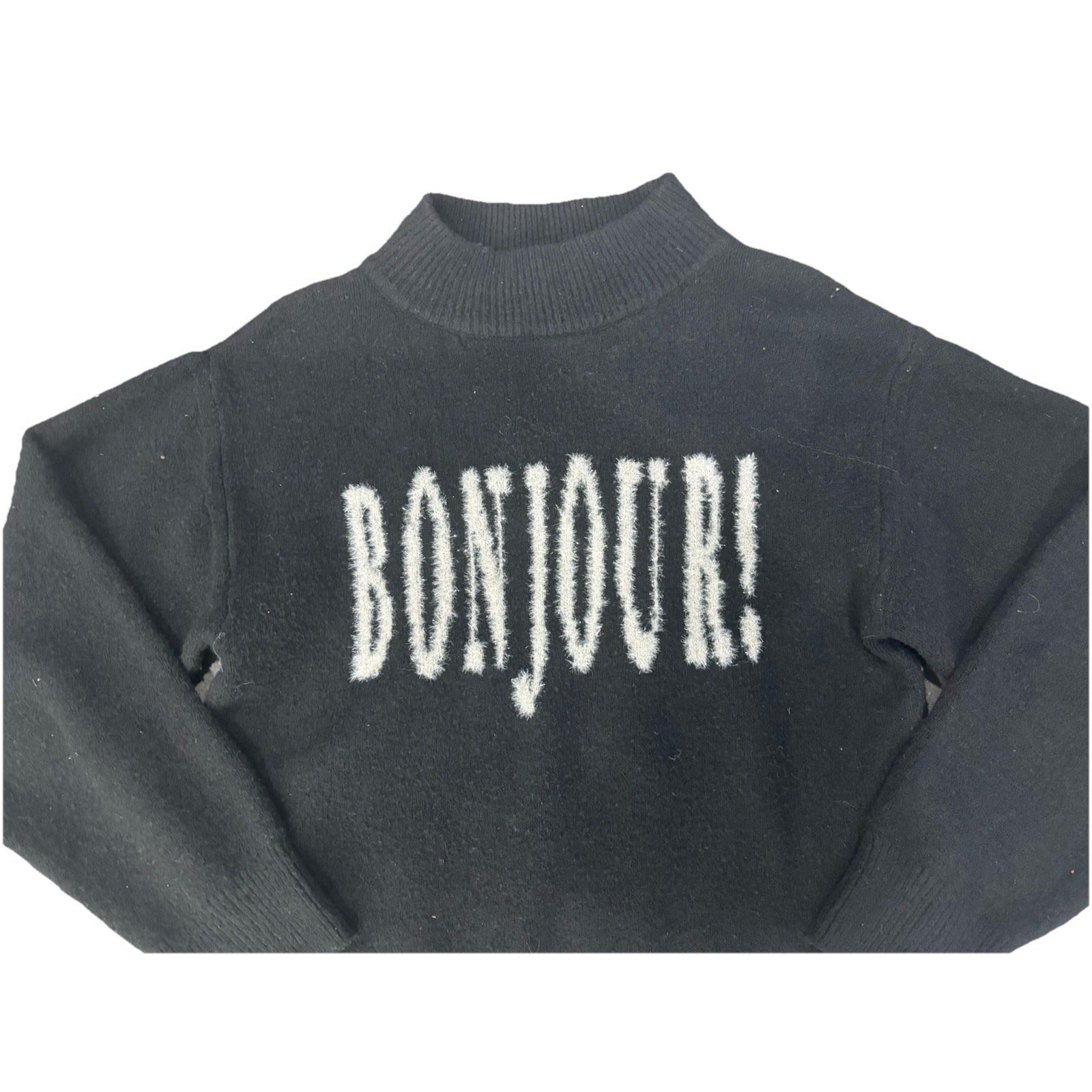 The A New Day women's small black Bonjour sweater is a stylish and versatile piece for your winter wardrobe. This crew neck pullover sweater features a graphic print of "Bonjour" on the front, adding a touch of charm to your outfit. The sweater is made from a blend of polyester, spandex, and acrylic, ensuring a comfortable fit with a hint of stretch. Perfect for travel, parties, casual outings, or business meetings, this tight-knit sweater is easy to care for with machine washable material. Stay warm and stylish this season with this classic black sweater adorned with glitter accents.