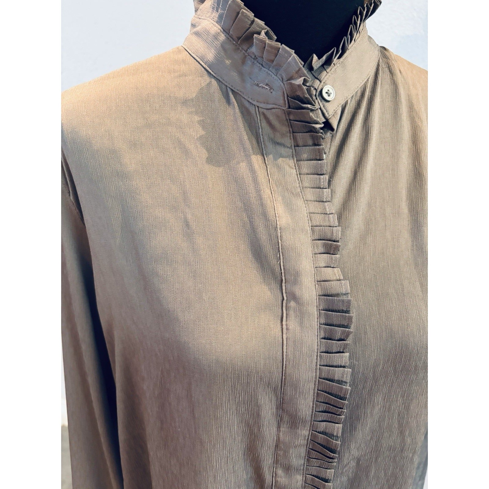 The Banana Republic Accordion Ruffle Collar Shimmer Blouse in size Medium is a stylish and versatile top suitable for casual, workwear, and business occasions. Made of lightweight polyester material in a solid brown color, this blouse features a collared neckline with a ruffle accent and long sleeves with button closure. With its regular fit and basic style, this blouse is ideal for the winter, fall, and spring seasons. Designed by Banana Republic, this blouse is sure to add a touch of elegance to any outfit.