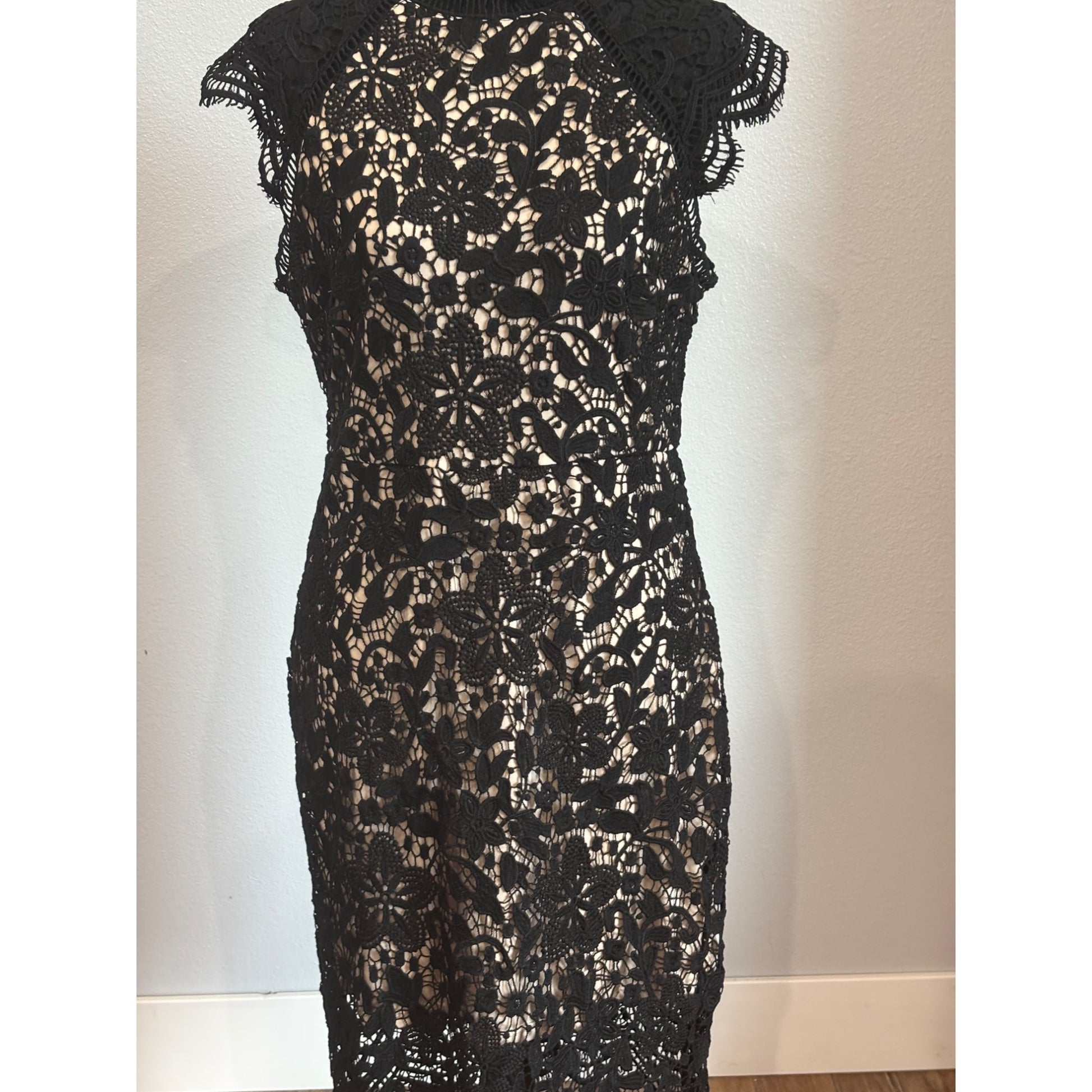 This elegant black lace dress features a beige lining, offering a striking contrast. Its midi length and delicate floral pattern make it a chic choice. The fitted design and cap sleeves provide a flattering silhouette, perfect for adding a sophisticated touch to your wardrobe.