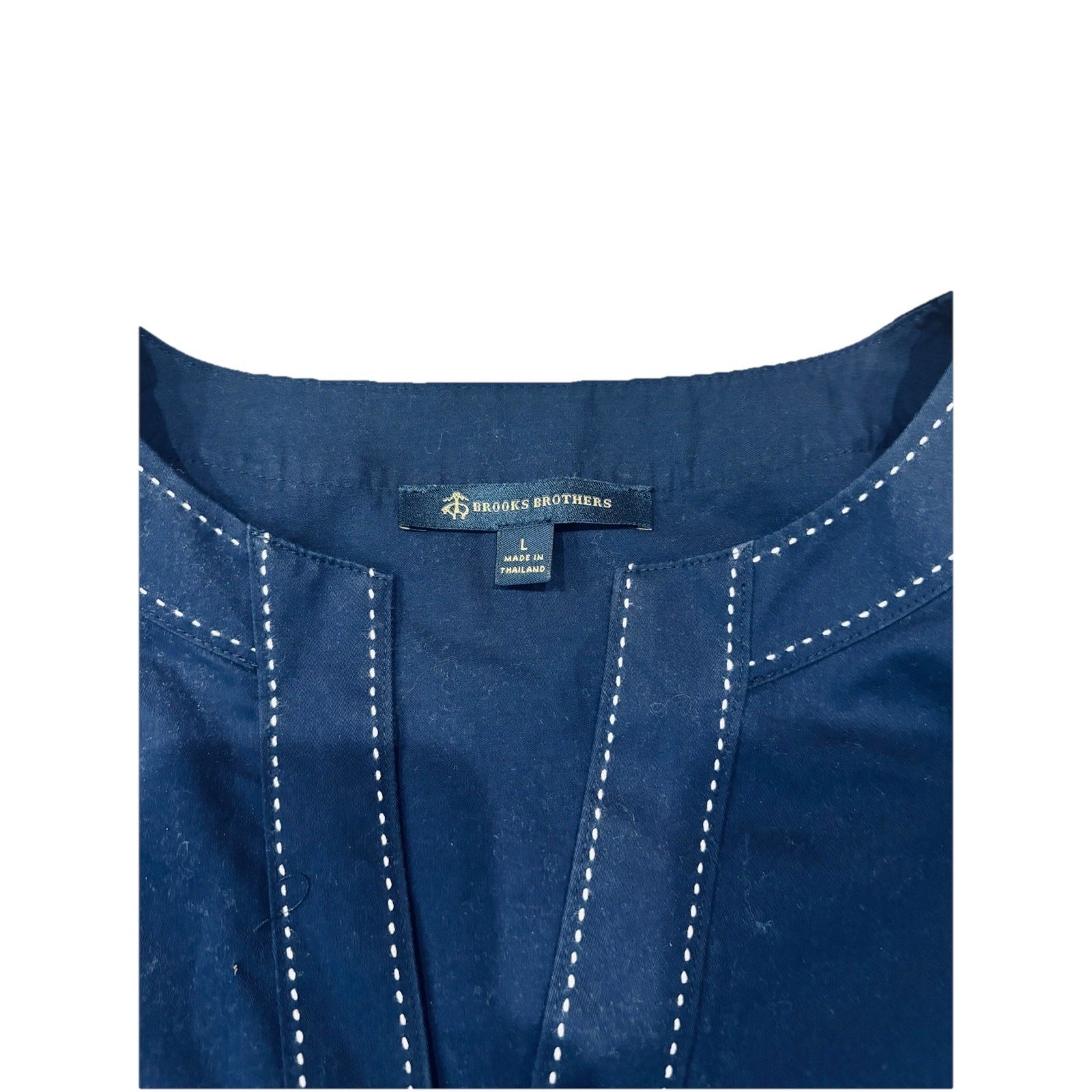 This Brooks Brothers tunic blouse in navy blue is a stylish and versatile addition to any woman's wardrobe. Made from comfortable cotton fabric, this top features 3/4 bell sleeves and a flattering V-neckline. The embroidered accents add a touch of elegance to this casual yet chic piece, perfect for the summer and spring seasons. Machine washable and in a size large, this tunic blouse is a timeless choice from a renowned brand like Brooks Brothers.
