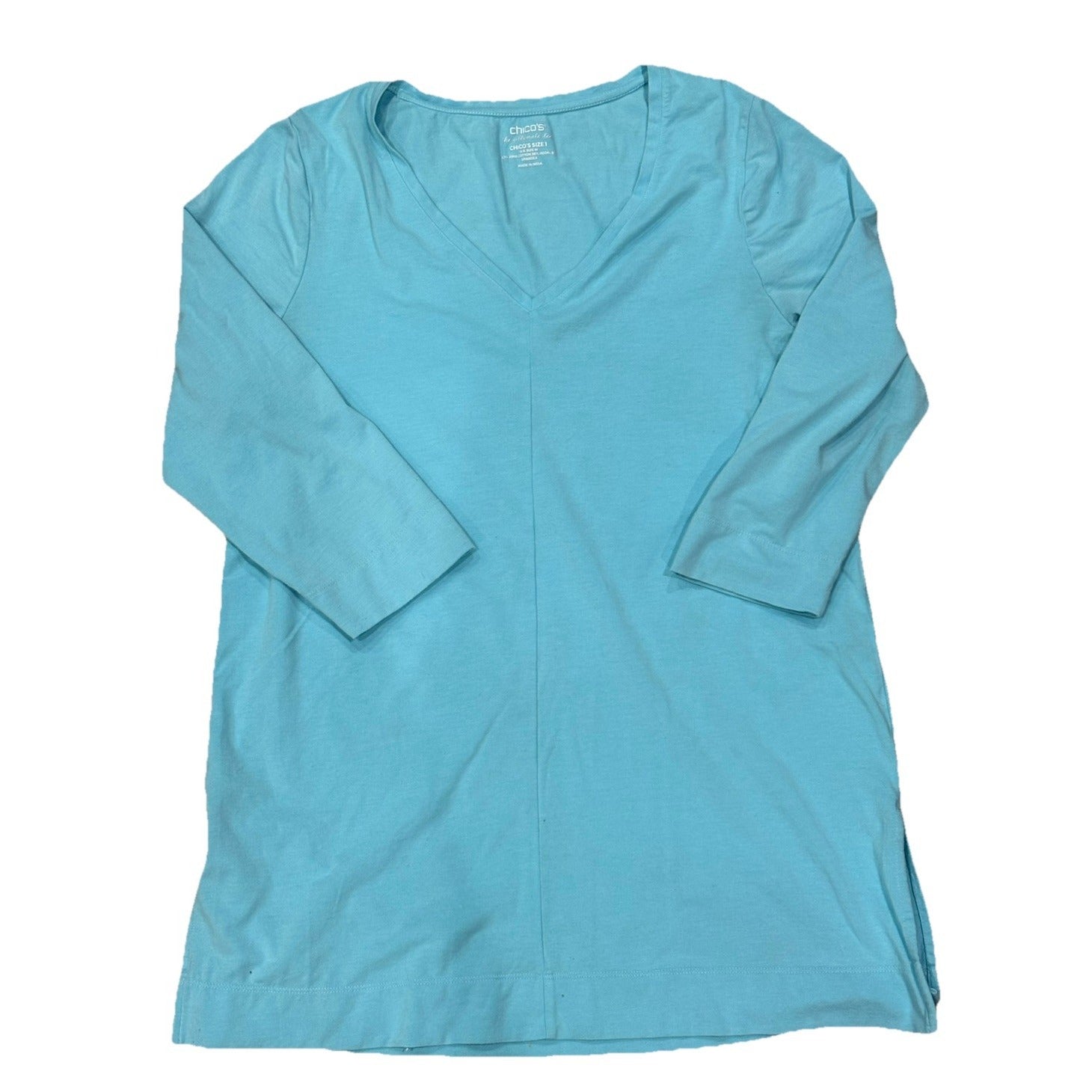 Chicos T Shirt Womens 1 Cyan Blue True Color Tees V Neck Long Sleeve Classic