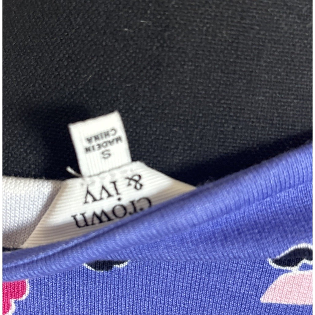 The Crown & Ivy Top is a women's blue and purple floral patterned long bell sleeve top with a round neckline. Made from a rayon blend material, this top features a classic fit and is machine washable. The colorful floral pattern adds a vibrant touch to the basic style, making it a stylish choice for everyday wear. Perfect for any woman looking to add a touch of blue and purple to her outfit collection.