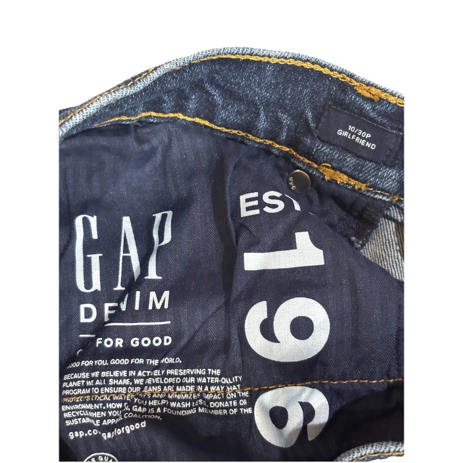 The Gap Girlfriend Mid Rise Tapered Jeans in a dark wash blue are designed specifically for women in size 10P with a regular fit. Made from a blend of polyester, spandex, rayon, cotton, and cotton blend denim fabric, these jeans feature a solid pattern, zip closure, and stretch for added comfort. The mid rise and tapered style offer a modern and flattering look, while the pockets provide functionality. Perfect for everyday wear or dressing up, these Gap jeans are a versatile wardrobe staple.