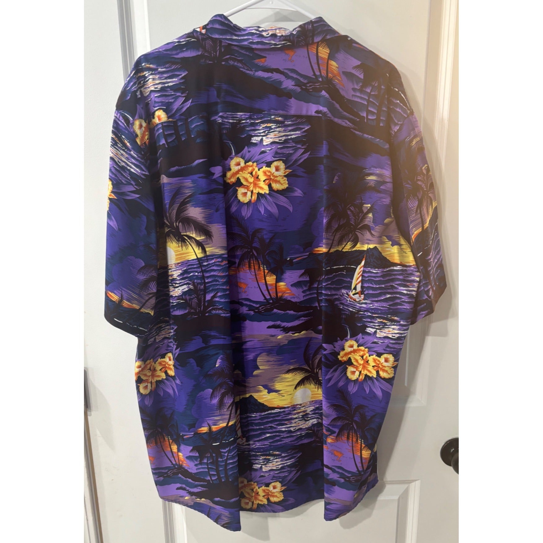 This vibrant Hawaiian shirt is a fun and comfortable choice for adding a splash of tropical flair to your wardrobe. The lightweight fabric boasts a colorful design featuring sunsets, palm trees, and sailboats, perfect for casual days or vacations. Made in Italy with attention to detail and quality.