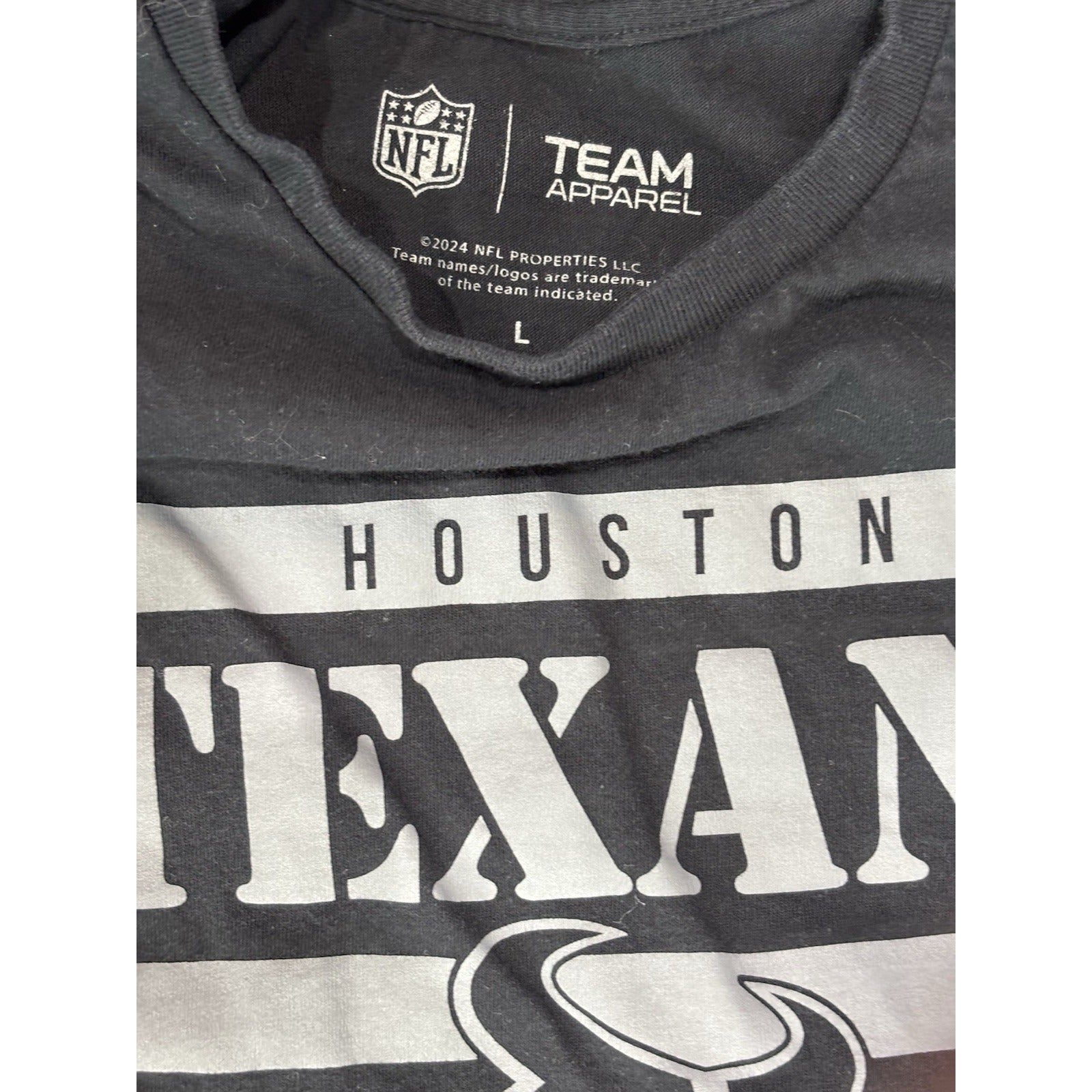 This product is an official Houston Texans NFL T-shirt in men's size large. Made of 100% cotton, the black shirt features the team's logo and is designed for fans of the National Football League. The shirt is authentic NFL apparel, making it a perfect choice for showing support for the Houston Texans during football season.