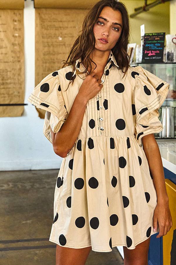 ID4283 Ruffle Sleeve Pintuck Detail Polka Dot Mini Dress