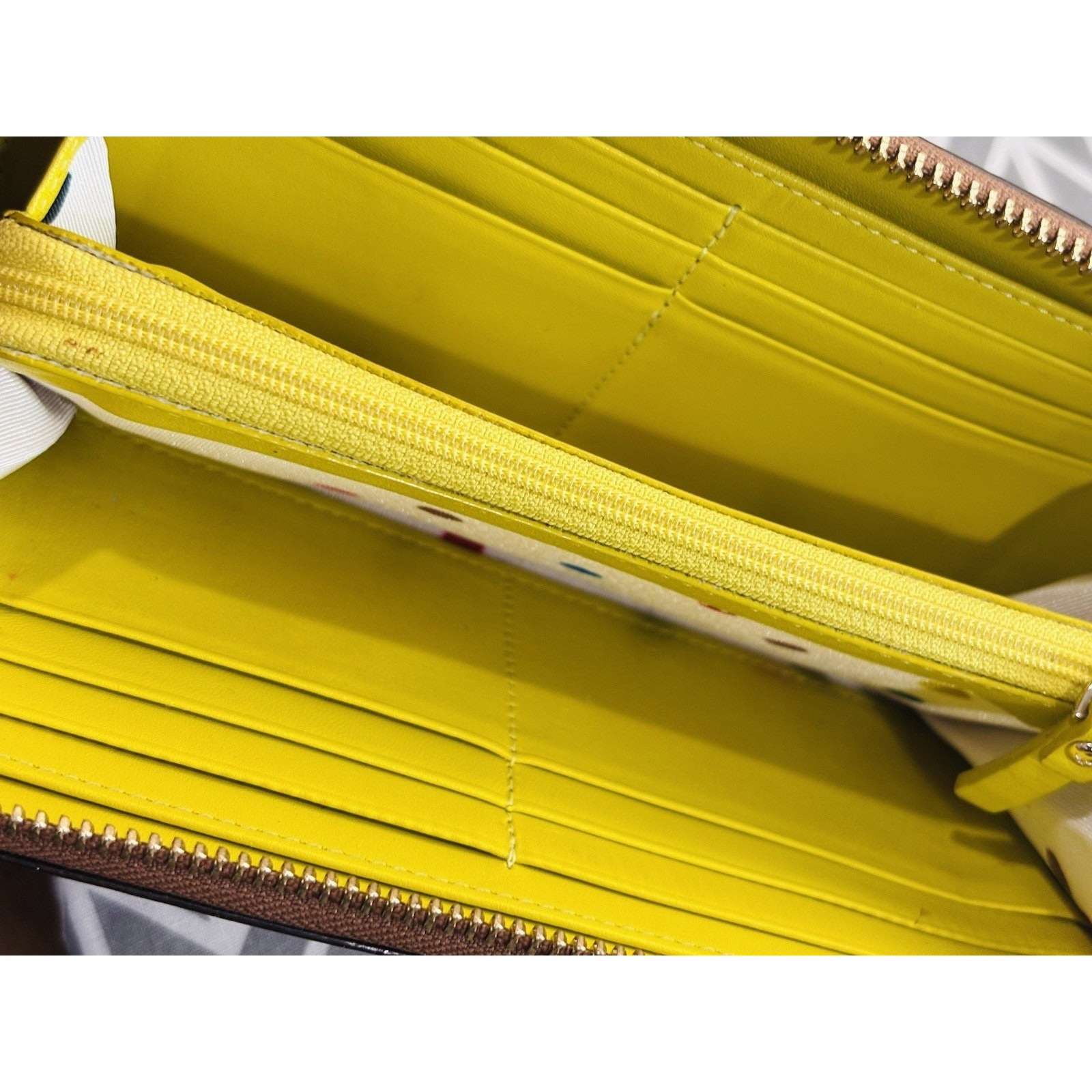 The Kate Spade Wellesley Neda Zip Around Accordion Wallet in brown is a stylish and practical accessory for women. Made of leather and canvas fabric, this wallet features a solid pattern with a zipper closure and logo accents. It includes multiple credit card slots and a zip-around feature for added convenience. The wallet's design is inspired by the Wellesley Campus and incorporates elements of rose, tropical themes, and the Kate Spade logo, making it a perfect choice for those who appreciate a blend of fashion and functionality in their accessories.