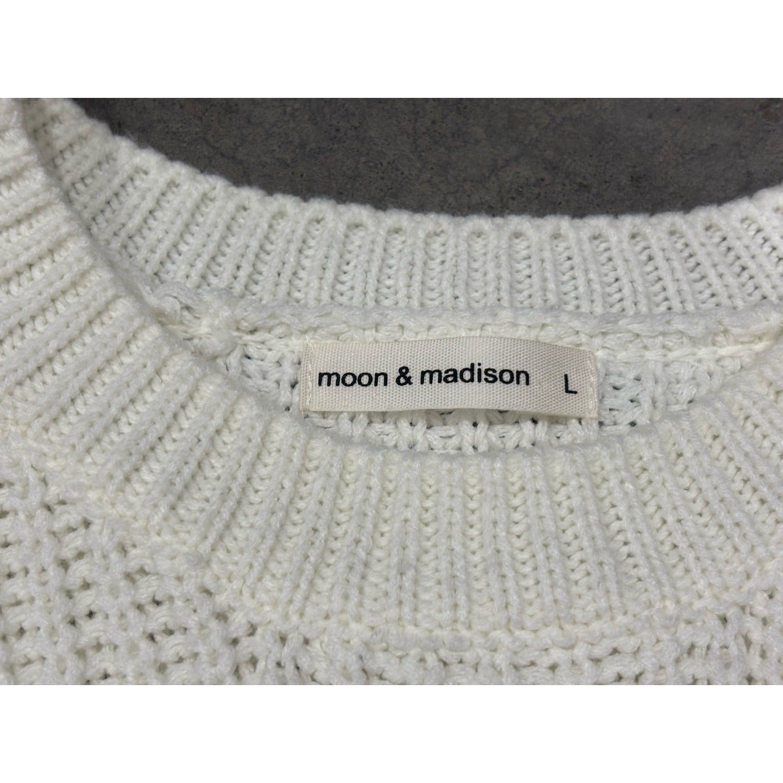 The Moon & Madison Knit Cropped Sweater is a stylish and cozy women's piece in a size large, featuring dark blue stripes. This chunky-knit sweater has a relaxed fit, long sleeves, and a crew neckline, perfect for a casual occasion. Made from 100% acrylic material, this sweater offers stretch and is ideal for the winter, fall, and spring seasons.