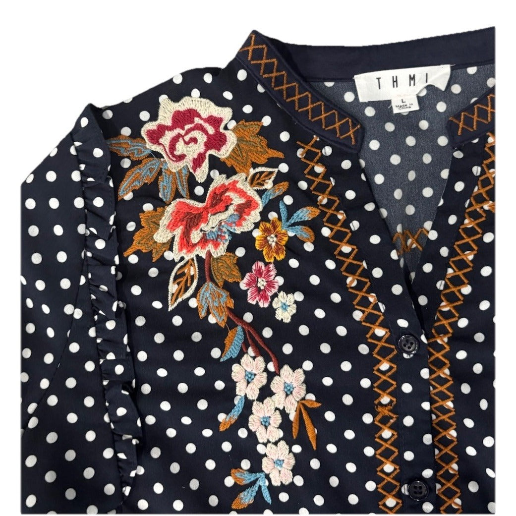THMI Blouse Polka Dots Floral Embroidery Long Sleeve Large