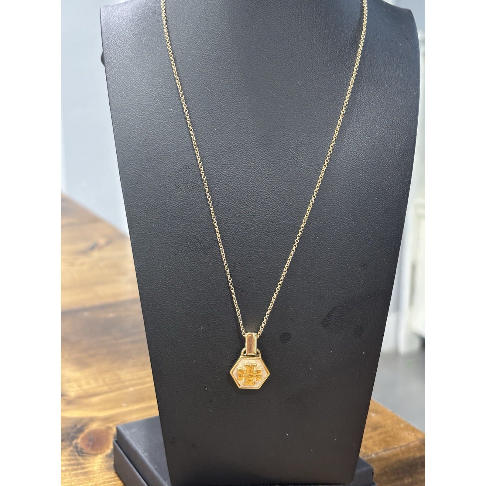 The Tory Burch Gold and White Mother of Pearl Hexagon Necklace is a stylish and elegant piece of jewelry that features a chain and pendant design. The necklace is crafted by the renowned brand Tory Burch, known for their high-quality and fashionable accessories. The gold color adds a touch of luxury to the piece, while the white Mother of Pearl stones add a modern and chic touch. Perfect for adding a touch of sophistication to any outfit, this necklace is a versatile and timeless addition to any jewelry collection.